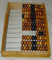 An abacus (plurals abacuses or abaci), also called a counting frame, is a calculating tool for performing arithmetic processes. Nowadays, abaci are often constructed as a wooden frame with beads sliding on wires, but originally they were beads or stones moved in grooves in sand or on tablets of wood, stone, or metal. The abacus was in use centuries before the adoption of the written modern numeral system and is still widely used by merchants and clerks in China, Japan, Africa, India and elsewhere.