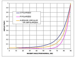 Water reflects light very differently from typical terrestrial materials. The reflectivity of a water surface is calculated using the Fresnel equations (see graph).