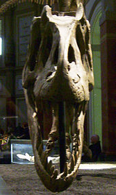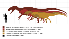 Allosaurus was a large bipedal predator. Its skull was large and equipped with dozens of large, sharp teeth. It averaged 8.5 m (28 ft) in length, though fragmentary remains suggest it could have reached over 12 m (39 ft). Relative to the large and powerful hindlimbs, its three-fingered forelimbs were small, and the body was balanced by a long, heavy tail. It is classified as an allosaurid, a type of carnosaurian theropod dinosaur. The genus has a complicated taxonomy, and includes an uncertain number of valid species, the best known of which is A. fragilis. The bulk of Allosaurus remains have come from North America's Morrison Formation, with material also known from Portugal and possibly Tanzania. It was known for over half of the 20th century as Antrodemus, but study of the copious remains from the Cleveland-Lloyd Dinosaur Quarry brought the name Allosaurus back to prominence, and established it as one of the best-known dinosaurs.