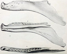 Allosaurus is regarded as a probable synonym of the genera Antrodemus, Creosaurus, Epanterias, and Labrosaurus. Most of the species that are regarded as synonyms of A. fragilis, or that were misassigned to the genus, are obscure and were based on scrappy remains. One exception is Labrosaurus ferox, named in 1884 by Marsh for an oddly formed partial lower jaw, with a prominent gap in the tooth row at the tip of the jaw, and a rear section greatly expanded and turned down. Later researchers suggested that the bone was pathologic, showing an injury to the living animal, and that part of the unusual form of the rear of the bone was due to plaster reconstruction. It is now regarded as an example of A. fragilis. Other remains thought to pertain to Allosaurus have come from across the world, including Australia, Siberia, and Switzerland, but these fossils have been reassessed as belonging to other dinosaurs.