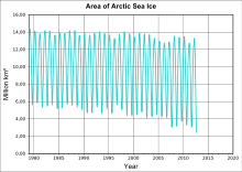 As can be seen in the two plot at the right, since about 1995 to 2000, all three size numbers of the arctic sea ice shield (extent, area and volume) are decreasing in an accelerated way (extent can be seen here: ). This downward movement is modulated by statistical variations, which lead to considerable media attention, when a new record has been reached.