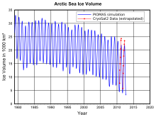 As the volume of sea ice until recently could not be measured by remote sensing as easy as its extent, numerical models have been made to estimate the ice thickness field between known points, which then is summed up to yield ice volume. The resulting volume over time – plot reveals a much stronger loss of ice than ice extent studies suggest.