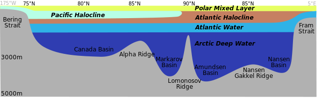 In large parts of the Arctic Ocean, the top layer (about 50 m) is of lower salinity and lower temperature than the rest. It remains relatively stable, because the salinity effect on density is bigger than the temperature effect. It is fed by the freshwater input of the big Siberian and Canadian streams (Ob, Yenissey, Lena, MacKenzie), the water of which quasi floats on the saltier, denser, deeper ocean water. Between this lower salinity layer and the bulk of the ocean lies the so-called halocline, in which both salinity and temperature are rising with increasing depth.