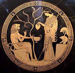 Plato, in Cratylus (407B) gave the etymology of her name as signifying "the mind of god", theou noesis. The Christian apologist of the 2nd century Justin Martyr takes issue with those pagans who erect at springs images of Kore, whom he interprets as Athena: