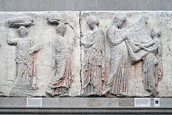 The Mourning Athena is a relief sculpture that dates around 460 BC and portrays a weary Athena resting on a staff. In earlier, archaic portraits of Athena in Black-figure pottery, the goddess retains some of her Minoan-Mycenaean character, such as great bird wings although this is not true of archaic sculpture such as those of Aphaean Athena, where Athena has subsumed an earlier, invisibly numinous— Aphaea—goddess with Cretan connections in her mythos.