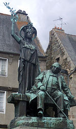 Jean Boucher's statue of the seated skeptical thinker Ernest Renan, shown to the left, caused great controversy when it was installed in Tréguier, Brittany in 1902. Renan's 1862 biography of Jesus had denied his divinity, and he had written the " Prayer on the Acropolis" addressed to the goddess Athena. The statue was placed in the square fronted by the cathedral. Renan's head was turned away from the building, while Athena, beside him, was depicted raising her arm, which was interpreted as indicating a challenge to the church during an anti-clerical phase in French official culture. The installation was accompanied by a mass protest from local Roman Catholics and a religious service against the growth of skepticism and secularism.