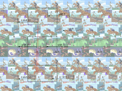 The following wall-eyed autostereogram encodes 3 planes across the x-axis. The background plane is on the left side of the picture. The highest plane is shown on the right side of the picture. There is a narrow middle plane in the middle of the x-axis. Starting with a background plane where icons are spaced at 140 pixels, one can raise a particular icon by shifting it a certain number of pixels to the left. For instance, the middle plane is created by shifting an icon 10 pixels to the left, effectively creating a spacing consisting of 130 pixels. The brain does not rely on intelligible icons which represent objects or concepts. In this autostereogram, patterns become smaller and smaller down the y-axis, until they look like random dots. The brain is still able to match these random dot patterns.