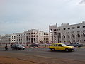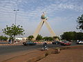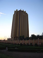 The BCEAO Tower at 20 storeys is the tallest building in the West African nations. It sits of the north ("right") bank of the River Niger in the city centre of Bamako. The BCEAO Tower is the Malian headquarters of the Central Bank of West African States, which provides development banking and government financial and currency services in several Francophone West African nations. Classified as Neo-Sudanic architecture, it is modeled on the Sudano-Sahelian architecture of the famous mosques of Djenne and Timbuktu. The building is located in the busy Commune III neighbourhood, where "Avenue Moussa Tavele" meets the waterside boulevard between the two main Bamako bridges : King Fahd Bridge a block west and Martyrs Bridge three blocks east. Just to the east of the BCEAO complex, a park and formal garden marks where the diagonally running "Boulevard du Peuple" reaches the river. By contrast, small market gardens and launching points or river canoes lie along the river front. With the Hotel de l'Amitié and the Bamako Grand Mosque, the BCEAO Tower is one of three landmarks visible across most of the city. Also of note is the Bamako Cathedral.