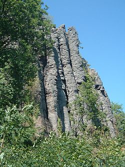 The word "basalt" is ultimately derived from Late Latin basaltes, misspelling of L. basanites "very hard stone," which was imported from Ancient Greek βασανίτης (basanites), from βάσανος (basanos, "touchstone") and originated in Egyptian bauhun "slate". The modern petrological term basalt describing a particular composition of lava-derived rock originates from its use by Georgius Agricola in 1556 in his famous work of mining and mineralogy De re metallica, libri XII. Agricola applied "basalt" to the volcanic black rock of the Schloßberg (local castle hill) at Stolpen, believing it to be the same as Pliny the Elder's "very hard stone".