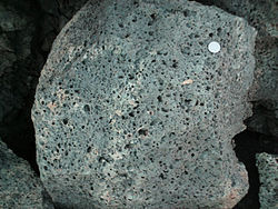 Basalt (pron.: / b ə ˈ s ɔː l t /, / ˈ b æ s ɒ l t /, / ˈ b æ s ɔː l t /, or / ˈ b eɪ s ɔː l t /) is a common extrusive igneous ( volcanic) rock formed from the rapid cooling of basaltic lava exposed at or very near the surface of a planet or moon. By definition, basalt must be an aphanitic igneous rock with less than 20% quartz and less than 10% feldspathoid by volume, and where at least 65% of the feldspar is in the form of plagioclase. (In comparison, granite has more than 20% quartz by volume.) Basalt is usually grey to black in colour, but rapidly weathers to brown or rust-red due to oxidation of its mafic (iron-rich) minerals into rust. It almost always has a fine-grained mineral texture due to the molten rock cooling too quickly for large mineral crystals to grow, although it can sometimes be porphyritic, containing the larger crystals formed prior to the extrusion that brought the lava to the surface, embedded in a finer-grained matrix. Basalt with a vesicular or frothy texture is called scoria, and forms when dissolved gases are forced out of solution and form vesicles as the lava decompresses as it reaches the surface.
