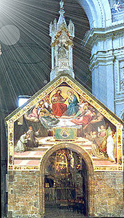 - a terracotta by Andrea della Robbia (c. 1490) with in the top from left to right :"St. Francis receives the Stigmata", "Coronation of Mary" and "St. Jerome the penitent"; bottom, from left to right : "the Annunciation", "the Nativity", and "the Adoration of the Magi".