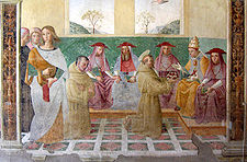 From the rose garden, one enters the Rose Chapel. This was the cell where St. Francis rested and spent the rest of the night in prayer and penance. Here St. Francis also met Saint Anthony of Padua. After his death a chapel was built in the 13th century, enlarged in the 15th century by St. Bernardine of Siena. It was decorated between 1506 and 1516 with a series of frescoes by several painters, among which the Umbrian Tiberio d'Assisi, depicting the early Franciscan community and the first saints of the order, the miracle of the roses and the concession of the indulgence
