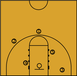 4. power forward: plays offensively often with his back to the basket; on defense, plays under the basket (in a zone defense) or against the opposing power forward (in man-to-man defense)