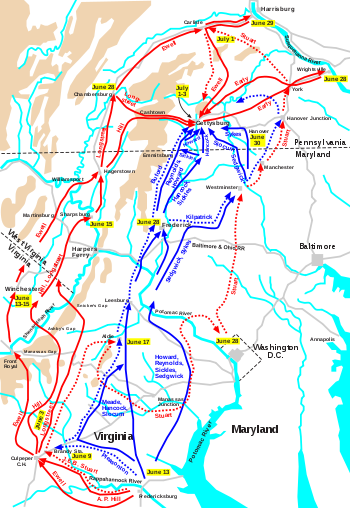 Shortly after the Army of Northern Virginia won a decisive victory over the Army of the Potomac at the Battle of Chancellorsville ( April 30– May 6, 1863), Robert E. Lee decided upon a second invasion of the North (the first was the unsuccessful Maryland Campaign of September 1862). Such a move would upset Federal plans for the summer campaigning season and possibly relieve the besieged Confederate garrison at Vicksburg. It would allow the Confederates to live off the bounty of the rich Northern farms while giving war-ravaged Virginia a much needed rest. In addition, Lee's 72,000-man army could threaten Philadelphia, Baltimore, and Washington, and possibly strengthen the growing peace movement in the North.