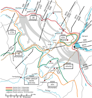The German 6th Army was only a few dozen kilometers from Stalingrad, and 4th Panzer Army, now to their south, turned northwards to help take the city. To the south, Army Group A was pushing far into the Caucasus, but their advance slowed as supply lines grew overextended. The two German army groups were not positioned to support one another due to the great distances involved.