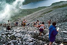 The Ben Nevis Race has been run in its current form since 1937. It now takes place on the first Saturday in September every year, with a maximum of 500 competitors taking part. It starts and finishes at the Claggan Park football ground on the outskirts of Fort William, and is 14 kilometres (8.7 mi) long with 1,340 metres (4,400 ft) of ascent. Due to the seriousness of the mountain environment, entry is restricted to those who have completed three hill races, and runners must carry waterproofs, a hat, gloves and a whistle; anyone who has not reached the summit after two hours is turned back. As of 2010 the records have stood unbroken since 1984, when Kenny Stuart and Pauline Haworth of Keswick Athletic Club won the men's and the women's races with times of 1:25:34 and 1:43:25 respectively.