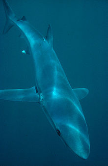 The blue shark (Prionace glauca) is a species of requiem shark, family Carcharhinidae, that inhabits deep waters in the world's temperate and tropical oceans. Preferring cooler waters, blue sharks migrate long distances, for example from New England to South America.