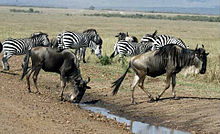 The blue wildebeest (Connochaetes taurinus), also called the common wildebeest or the white-bearded wildebeest, is a large antelope and one of two species of wildebeest. Males can grow to a 145 cm (57 in) shoulder height and attain a body mass of over 275 kg (610 lb). They range the open plains, bushveld, and dry woodlands of Southern and East Africa, living for more than 20 years. The male is highly territorial, using scent markings and other devices to protect his domain. The largest population is in the Serengeti, numbering over one million animals. They are a major prey item for lions, hyenas, and crocodiles.