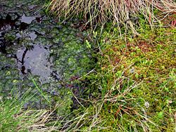 A bog or mire is a wetland type that accumulates acidic peat, a deposit of dead plant material – usually mosses, but also lichens in Arctic climates. Bogs occur where the water at the ground surface is acidic, either from acidic ground water, or where water is derived entirely from precipitation, when they are termed ombrotrophic (rain-fed). Water flowing out of bogs has a characteristic brown colour, from dissolved peat tannins. Bogs are very sensitive habitats, of high importance for biodiversity.