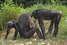 Bonobo males occasionally engage in various forms of male–male genital behaviour. In one form, two males hang from a tree limb face-to-face while " penis fencing". This also may occur when two males rub their penises together while in face-to-face position. Another form of genital interaction ("rump rubbing") occurs to express reconciliation between two males after a conflict, when they stand back-to-back and rub their scrotal sacs together. Takayoshi Kano observed similar practices among bonobos in the natural habitat.