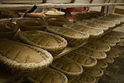 There are other ways of sourdough baking and culture maintenance. A more traditional one is the process that was followed by peasant families throughout Europe in past centuries. The family (usually the woman was in charge of breadmaking) would bake on a fixed schedule, perhaps once a week. The starter was saved from the previous week's dough. The starter was mixed with the new ingredients, the dough was left to rise, and then a piece of it was saved (to be the starter for next week's bread). The rest was formed into loaves that were marked with the family sign (this is where today's decorative slashing of bread loaves originates from) and taken to the communal oven to bake. These communal ovens with time evolved into the modern bakery.