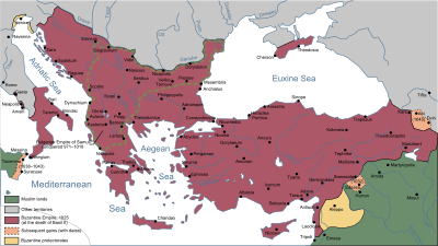 The Empire at its greatest extent under Justinian I, in 555 AD