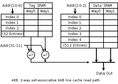 Similarly, because the cache is 4 kB and has a 4 B read path, and reads two ways for each access, the Data SRAM is 512 rows by 8 bytes wide.