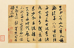 Cursive styles such as Xíngshū (semi-cursive or running script) and Cǎoshū (cursive or grass script) are less constrained and faster, where more movements made by the writing implement are visible. These styles' stroke orders vary more, sometimes creating radically different forms. They are descended from Clerical script, in the same time as Regular script ( Han Dynasty), but Xíngshū and Cǎoshū were use for personal notes only, and were never used as standard. Caoshu style was highly appreciated in Emperor Wu of Han reign (140-87).
