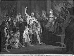 | "Caractacus before the Emperor Claudius at Rome", 18th-century print by an unknown artist ( British Museum). | |