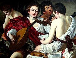 One secular piece from these years is Amor Victorious, painted in 1602 for Vincenzo Giustiniani, a member of Del Monte's circle. The model was named in a memoir of the early 17th century as "Cecco", the diminutive for Francesco. He is possibly Francesco Boneri, identified with an artist active in the period 1610-1625 and known as Cecco del Caravaggio ('Caravaggio's Cecco'), carrying a bow and arrows and trampling symbols of the warlike and peaceful arts and sciences underfoot. He is unclothed, and it is difficult to accept this grinning urchin as the Roman god Cupid – as difficult as it was to accept Caravaggio's other semi-clad adolescents as the various angels he painted in his canvases, wearing much the same stage-prop wings. The point, however, is the intense yet ambiguous reality of the work: it is simultaneously Cupid and Cecco, as Caravaggio's Virgins were simultaneously the Mother of Christ and the Roman courtesans who modeled for them.