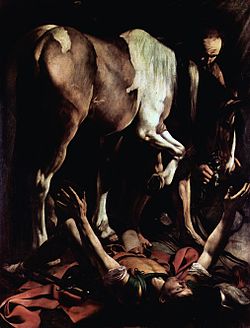 Caravaggio went on to secure a string of prestigious commissions for religious works featuring violent struggles, grotesque decapitations, torture and death. For the most part each new painting increased his fame, but a few were rejected by the various bodies for whom they were intended, at least in their original forms, and had to be re-painted or find new buyers. The essence of the problem was that while Caravaggio's dramatic intensity was appreciated, his realism was seen by some as unacceptably vulgar. His first version of Saint Matthew and the Angel, featured the saint as a bald peasant with dirty legs attended by a lightly clad over-familiar boy-angel, was rejected and a second version had to be painted as The Inspiration of Saint Matthew. Similarly, The Conversion of Saint Paul was rejected, and while another version of the same subject, the Conversion on the Way to Damascus, was accepted, it featured the saint's horse's haunches far more prominently than the saint himself, prompting this exchange between the artist and an exasperated official of Santa Maria del Popolo: "Why have you put a horse in the middle, and Saint Paul on the ground?" "Because!" "Is the horse God?" "No, but he stands in God's light!"