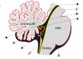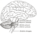 Similarly, the cerebellum follows the trend of "threes", with three major input and output peduncles (fibre bundles). These are the superior (brachium conjunctivum), middle (brachium pontis), and inferior (restiform body) cerebellar peduncles.