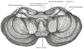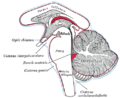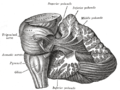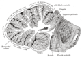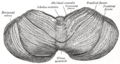 On gross inspection, three lobes can be distinguished in the cerebellum: the flocculonodular lobe, the anterior lobe (rostral to the "primary fissure"), and the posterior lobe (dorsal to the "primary fissure"). The latter two can be further divided in a midline cerebellar vermis and lateral cerebellar hemispheres.