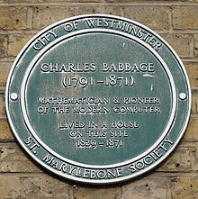 There is a green plaque commemorating the 40 years Babbage spent at 1 Dorset St, London. Locations, institutions and other things named after Babbage include:
