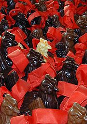 Chocolate is one of the most popular treats given on holidays. On Valentine's Day, a box of chocolate is given, usually with flowers and a greeting card. It is given on other holidays, including Christmas, Thanksgiving, and birthdays, although no special chocolate creation is common on these holidays. On Easter, chocolate eggs are popular gifts. A chocolate egg is a confectionery made primarily of chocolate, and can either be solid, hollow, or filled with cream.