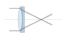 In optics, chromatic aberration is caused by a lens having a different refractive index for different wavelengths of light (the dispersion of the lens).