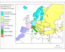 - Archdeaconry, e.g., the seven in the Diocese of Gibraltar in Europe. This is the area under the jurisdiction of an archdeacon. It consists of a number of deaneries.