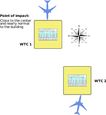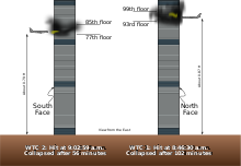 On September 11, 2001, hijackers associated with al-Qaeda took control of two early morning Los Angeles-bound flights—both Boeing 767 jetliners—soon after take off from Boston's Logan International Airport. In its final moments, American Airlines Flight 11 flew south over Manhattan and crashed at roughly 440 miles per hour (710 km/h) into the northern facade of the World Trade Centre's North Tower at 8:46 am, impacting between the 93rd and 99th floors. Seventeen minutes later, United Airlines Flight 175 approached from the southwest, over New York Harbour, and crashed into the South Tower's southern facade at 9:03 am between the 77th and 85th floors at 540 miles per hour (870 km/h). In addition to severing numerous load-bearing columns on the perimeter and inflicting other structural damage, the resulting explosions in each tower ignited 10,000 US gallons (38,000 L) of jet fuel along with office contents. Jet fuel from the impact traveled down at least one elevator shaft and exploded on the 78th floor of the North Tower, as well as in the main lobby.