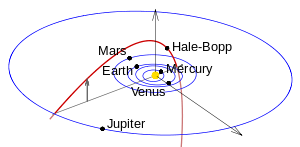 The comet likely made its last perihelion 4,200 years ago. Its orbit is almost perpendicular to the plane of the ecliptic, which ensures that close approaches to planets are rare. However, in April 1996 the comet passed within 0.77 AU of Jupiter, close enough for its orbit to be affected by the planet's gravity. The comet's orbit was shortened considerably to a period of roughly 2,533 years, and it will next return to the inner Solar System around the year 4385. Its greatest distance from the Sun ( aphelion) will be about 370 AU, reduced from about 525 AU.