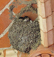Both the scientific and colloquial name of the bird are related to its use of man-made structures. It builds a closed cup nest from mud pellets under eaves or similar locations on buildings usually in colonies, but sometimes fouling below nests can be a problem.