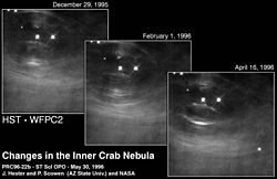 The pulsar's extreme energy output creates an unusually dynamic region at the centre of the Crab Nebula. While most astronomical objects evolve so slowly that changes are visible only over timescales of many years, the inner parts of the Crab show changes over timescales of only a few days. The most dynamic feature in the inner part of the nebula is the point where the pulsar's equatorial wind slams into the bulk of the nebula, forming a shock front. The shape and position of this feature shifts rapidly, with the equatorial wind appearing as a series of wisp-like features that steepen, brighten, then fade as they move away from the pulsar to well out into the main body of the nebula.