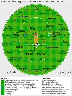 Apart from the one currently bowling, the other nine fielders are tactically deployed by the team captain in chosen positions around the field. These positions are not fixed but they are known by specific and sometimes colourful names such as "slip", "third man", "silly mid on" and "long leg". There are always many unprotected areas.