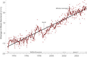 Since 1992 the NASA/CNES TOPEX/Poseidon (T/P) and Jason-1 satellite programs have provided measurements of sea level change. The current data are available at http://sealevel.colorado.edu/ and http://sealevel.jpl.nasa.gov/. The data show a mean sea level increase of 2.8±0.4 mm/yr. This includes an apparent increase to 3.7±0.2 mm/yr during the period 1999 through 2004. Satellites ERS-1 ( July 17 1991- March 10 2000), ERS-2 ( April 21 1995-), and Envisat ( March 1 2002-) also have sea surface altimeter components but are of limited use for measuring global mean sea level due to less detailed coverage.
