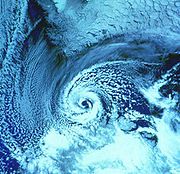 A polar low is a small-scale, short-lived atmospheric low pressure system (depression) that is found over the ocean areas poleward of the main polar front in both the Northern and Southern Hemispheres. The systems usually have a horizontal length scale of less than 1,000 km and exist for no more than a couple of days. They are part of the larger class of mesoscale weather systems. Polar lows can be difficult to detect using conventional weather reports and are a hazard to high-latitude operations, such as shipping and gas and oil platforms.
