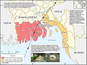 Cyclone Sidr slammed the highly vulnerable low lying densely populated coastal areas of Bangladesh with heavy rain, winds of up to 120 miles/hr, and a storm surge. Sidr may be the strongest cyclone to hit the country since a cyclone killed over 143,000 Bangladeshis in 1991. Although, the death from Sidr number in the hundreds but damage to homes, crops and livelihoods could be extensive. Under a Cyclone Preparedness Program, volunteers evacuated at least 600,000 Bangladeshis in the path of the storm. Many are housed in 1,800 multipurpose disaster shelters built along the coast. Relief organizations are distributing seven-day emergency disaster kits of food, blankets and clothing for evacuated families.