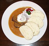 Unique Czech dishes include roast pork with bread dumplings and stewed cabbage Vepřo-knedlo-zelo, roast sirloin beef with steamed dumplings and cream-of-vegetable sauce Svíčková na smetaně, tomato sauce Rajská or dill sauce Koprovka, roast duck with bread or potato dumplings and braised red cabbage, a variety of beef and pork goulash stews Guláš, fried cheese Smažák or the famous potato pancakes Bramboráky, besides a large variety of delicate local sausages, wurst, pâtés and smoked meats and other traditional local foods. Czech desserts include a wide variety of whipped cream, chocolate and fruit pastries and tarts, crepes, creme desserts and cheese, poppy seed filled and other types of traditional cakes buchty and koláče.
