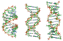 From left to right, the structures of A, B and Z DNA