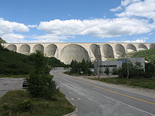 The multiple-arch dam consists of a number of single-arch dams with concrete buttresses as the supporting abutments, as for example the Daniel-Johnson Dam, Québec, Canada. The multiple-arch dam does not require as many buttresses as the hollow gravity type, but requires good rock foundation because the buttress loads are heavy.