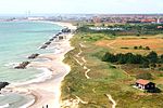 Denmark's northernmost point is Skagen's point (the north beach of the Skaw) at 57° 45' 7" northern latitude; the southernmost is Gedser point (the southern tip of Falster) at 54° 33' 35" northern latitude; the westernmost point is Blåvandshuk at 8° 4' 22" eastern longitude; and the easternmost point is Østerskær at 15° 11' 55" eastern longitude. This is in the archipelago Ertholmene 18 kilometres northeast of Bornholm. The distance from east to west is 452 kilometres (281 mi), from north to south 368 kilometres (229 mi).