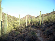 Deserts typically have a plant cover that is sparse but enormously diverse. The giant saguaro cacti of the Sonoran Desert provide nests for desert birds and serve as "trees" of the desert. Saguaro grow slowly but may live up to 200 years. When 9 years old, they are about 15 centimeters (6 in) high. After about 75 years, the cacti develop their first branches. When fully grown, saguaro cacti are 15 meters tall and weigh as much as 10 tons. They dot the Sonoran and reinforce the general impression of deserts as cactus-rich land.